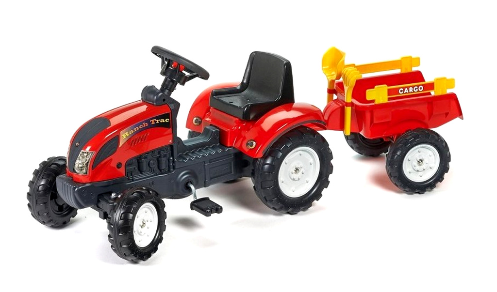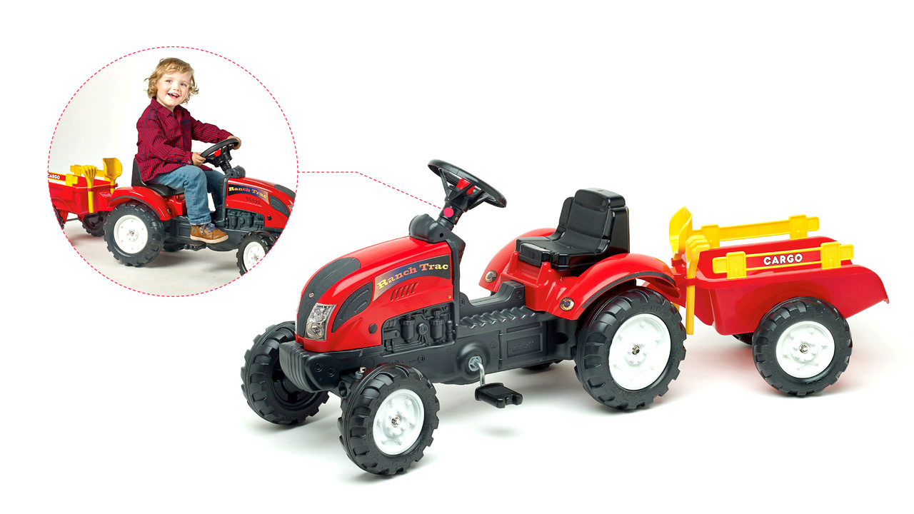 Šlapací traktor RANCH TRAC s odpojitelnou vlečkou, funkčním klaksonem na volantě, hráběmi a lopatkou do písku od francouzké firmy Falk, určený pro děti od 2 let.