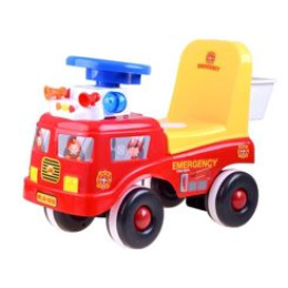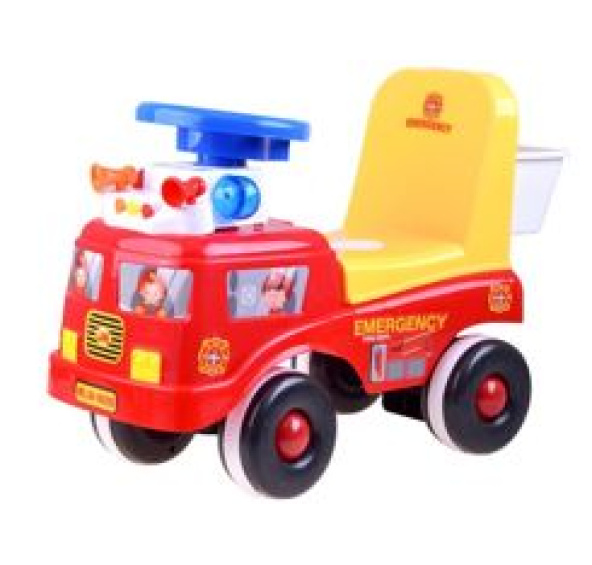 Vozidlo je celé vyrobeno z plastu. Auto má pohodlnou sedačku s vysokým opěradlem a košík na zadní straně sedačky pro potřeby malého hasiče. S autem můžete odbočit doprava, doleva. Pod volantem jsou dvě tlačítka, která aktivují zvukový efekt hasičské sirény a modrý a červený světelný efekt.