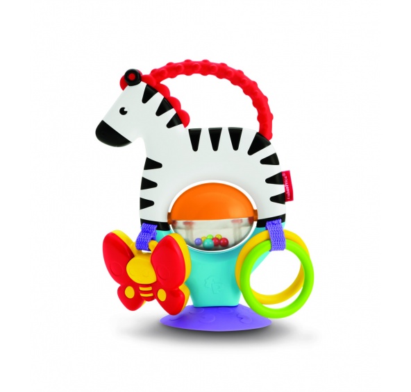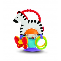 Připněte tuto roztomilou zebru k dětskému pultíku a vzrušující hra se smysly může začít! Svými černobílými pruhy, rukojetí sloužící jako kousátko a chrasticí nádobkou plnou barevných kuliček zabaví tato nová kamarádka vaše miminko kdekoli a kdykoli! Pro ještě více legrace je na zebře navíc zavěšený motýlek a klapátko! Natahování se po hračkách a plácání do nich pomůže rozvíjet hrubou motoriku vašeho dítěte. Kontrast barev, rozdílné typy povrchů a zábavné chrastění stimulují a zaměstnávají rozvíjející se smysly dětí. Je tolik věcí, které může vaše dítě objevovat – od zábavných chrastících kuliček až po zavěšená klapátka či krásného motýlka!
