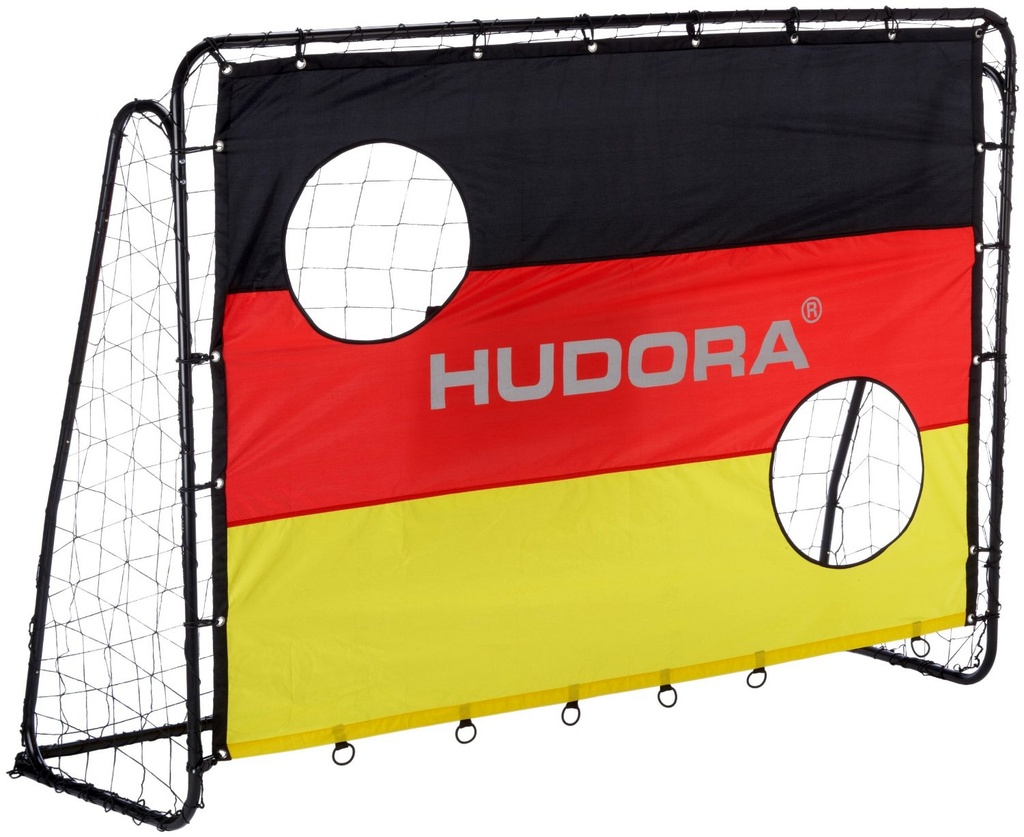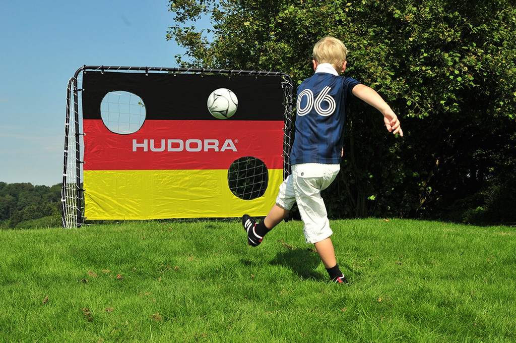 Kovová fotbalová branka s terčem, od německé firmy Hudora, určená pro rekreační použití a na trénink přesnosti střelby.