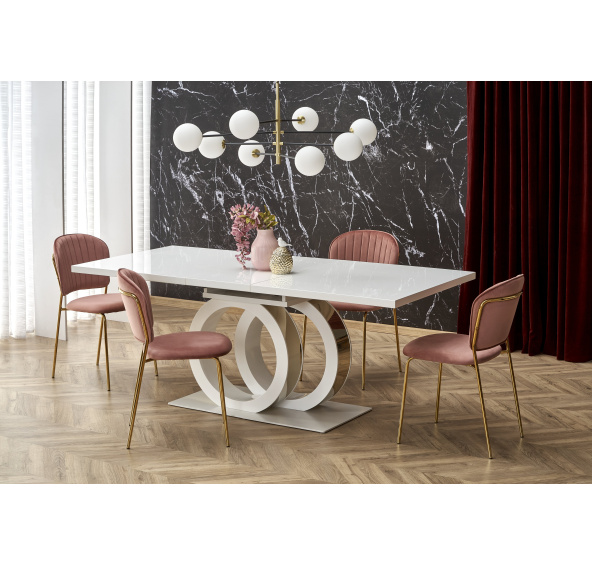 Popis produktu GALARDO stół rozkładany, biały / złoty (3p=1szt)wymiary: 160-200/90/76 cm, stół rozkładany, materiał: MDF lakierowany / stal nierdzewna / stal malowana proszkowo, kolor: biały - złoty