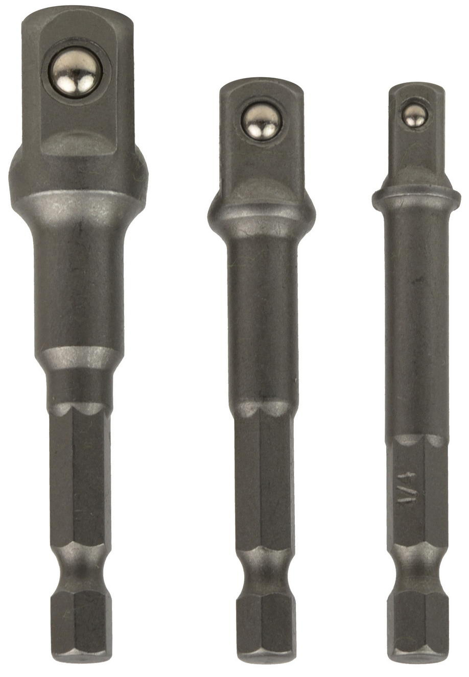 Sada čtyřhranných adaptérů s bezpečnostní kuličkou proti vypadnutí pro nástrčné hlavice ve třech velikostech 1/2", 3/8", 1/4".