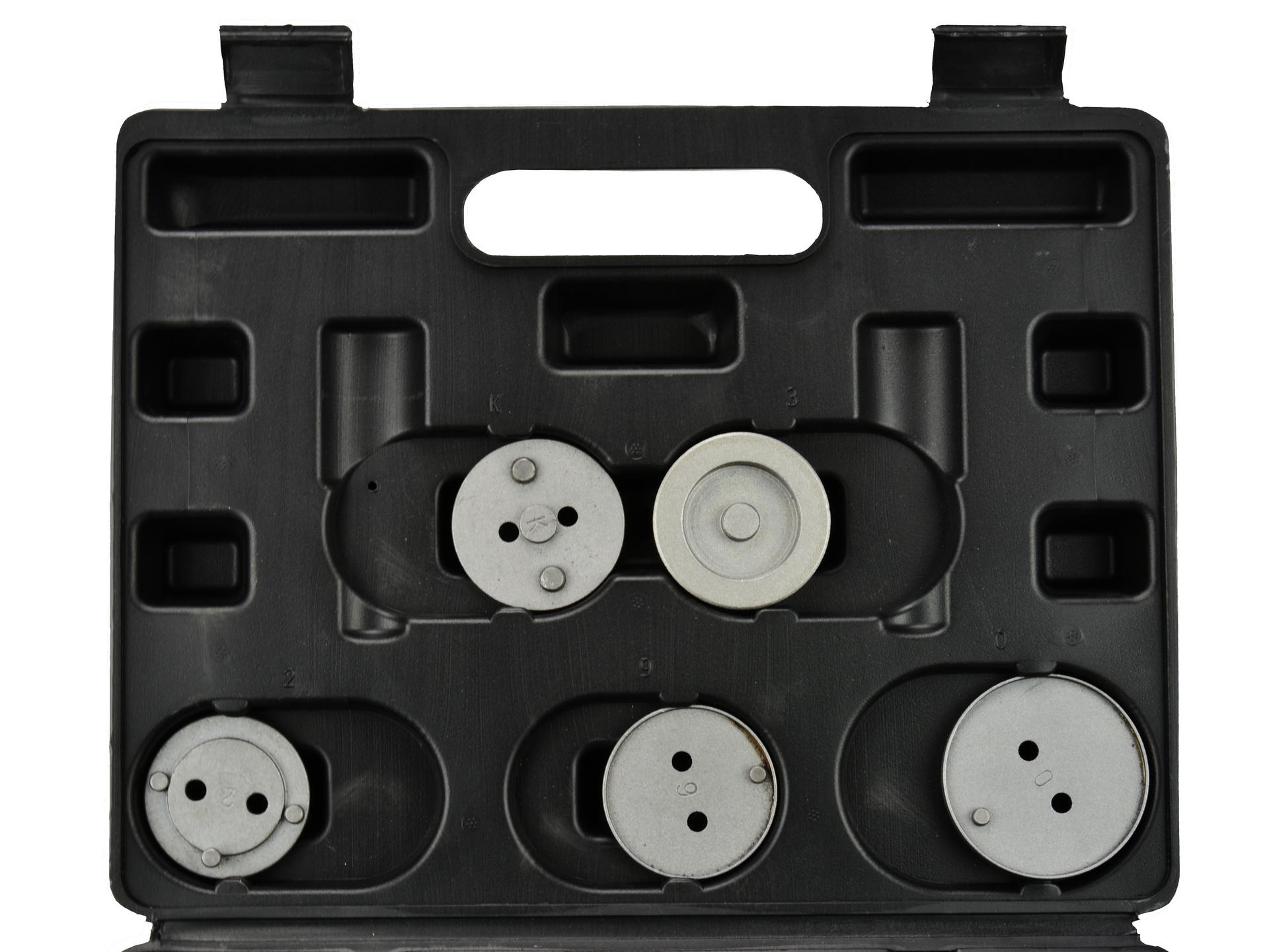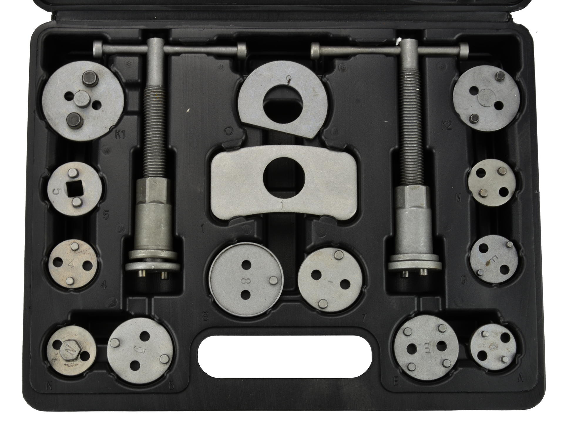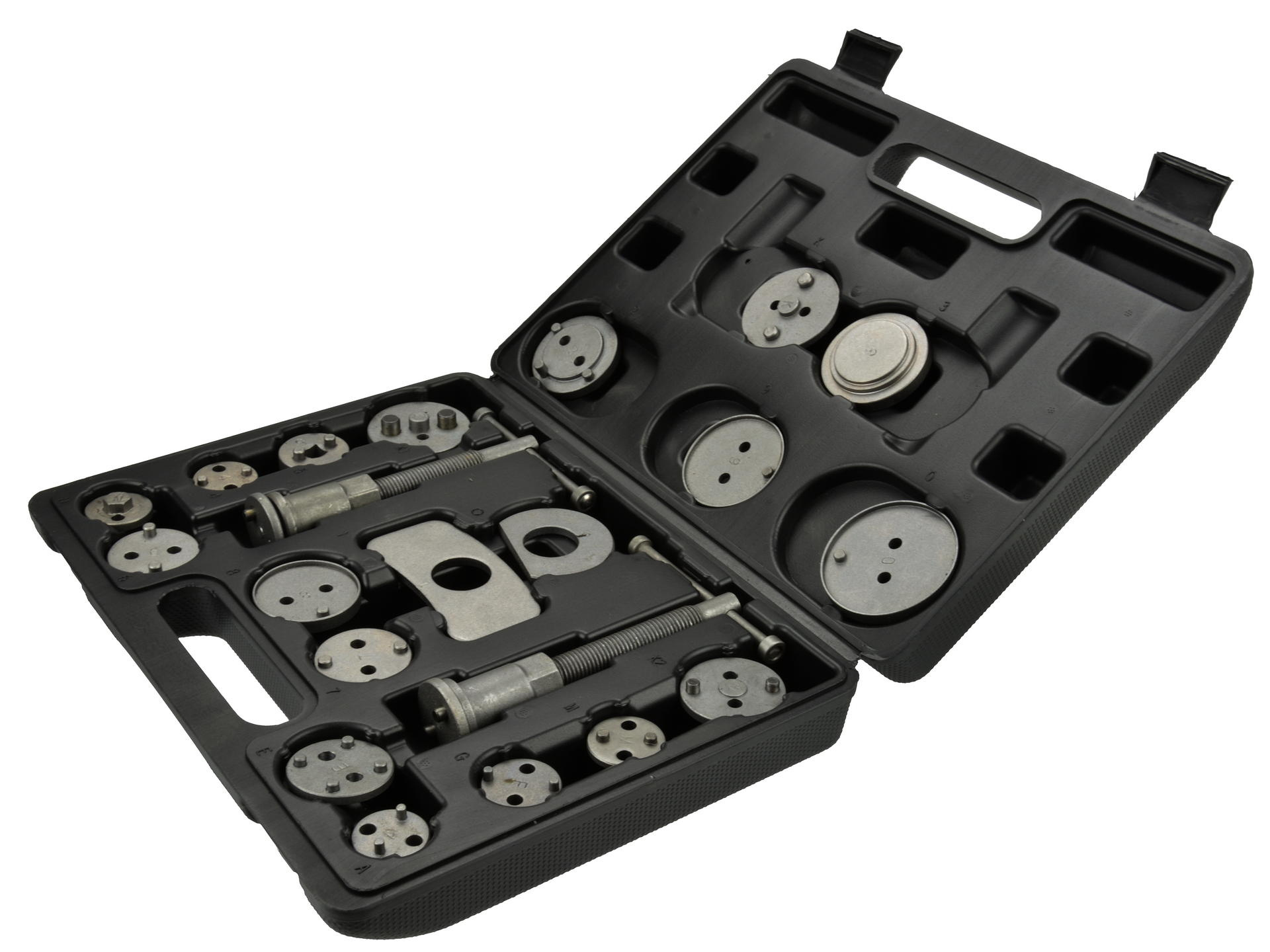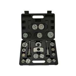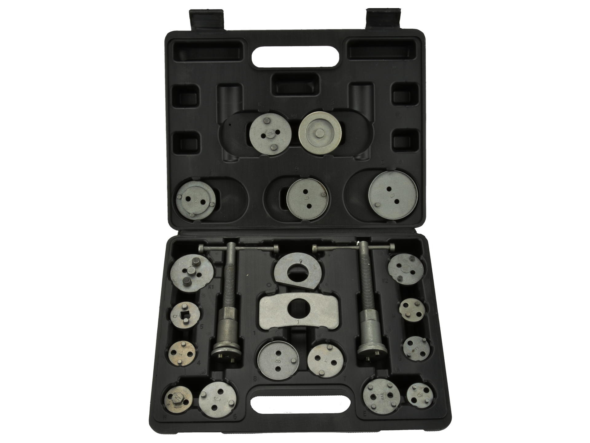 Celá sada pro zatlačení brzdových pístků je dodávána v plastovém kufru.