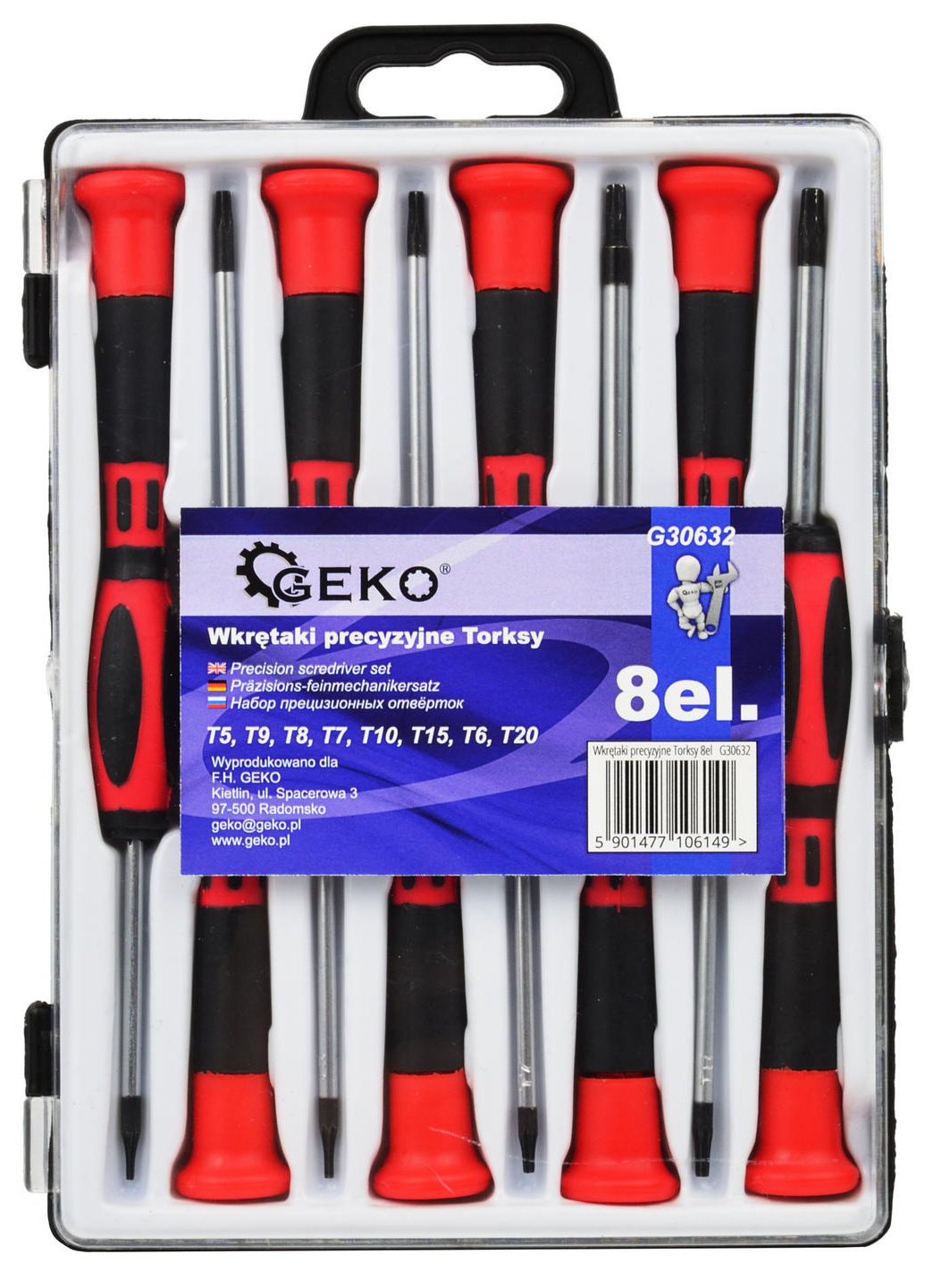 Sada obsahuje 8 kusů torx šroubováků s rukojetí z měkčeného i tvrdého plastu s protiskluzovou vrstvou.