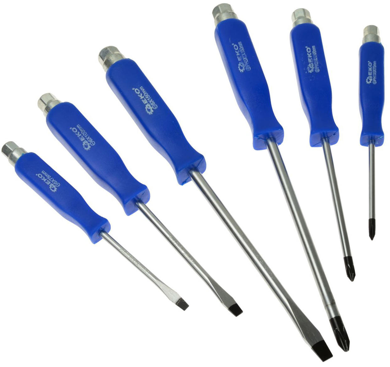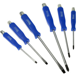Set úderových šroubováků obsahuje 3 křížové šroubováky a 3 ploché šroubováky s magnetickými hroty.