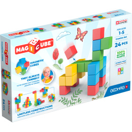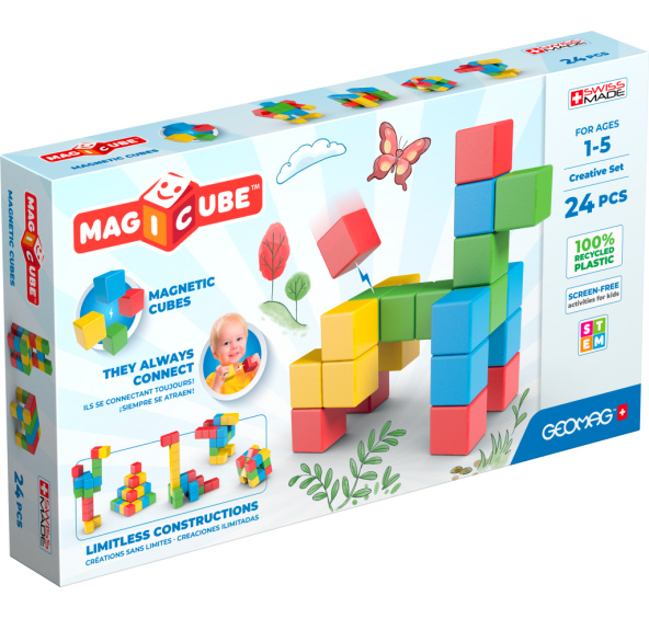 Díky speciální vnitřní konstrukci se magnetické kostičky přitahují ze všech šesti stran a drží i volně v prostoru - stavění ve 3D. Obsahuje 24 kostek ve čtyřech barvách. Vhodné od 1 roku.