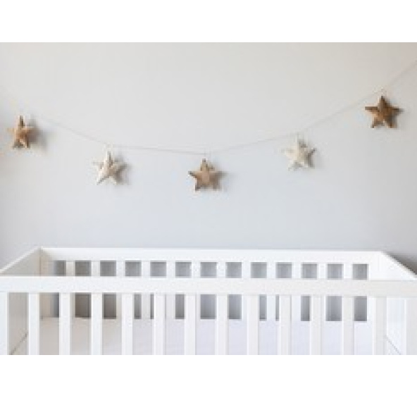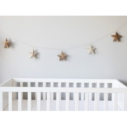 Krásná girlanda v jemných, nadčasových barvách je dokonalým doplňkem interiéru dětského pokoje. Lze jej namontovat vedle dětské postýlky, na stěnu, na baldachýn nebo nad stůl. Tento krásný doplněk bude dokonalým doplňkem každého interiéru pokoje vašeho dítěte. Věnec je ručně vyrobený a skládá se z 5 kusů zavěšených na zlatém bižuterním lanku. Příjemná, měkká srdíčka a hvězdičky jsou ušity s něhou ze sametového veluru. Věnec bude krásným dárkem pro mladší i starší děti.