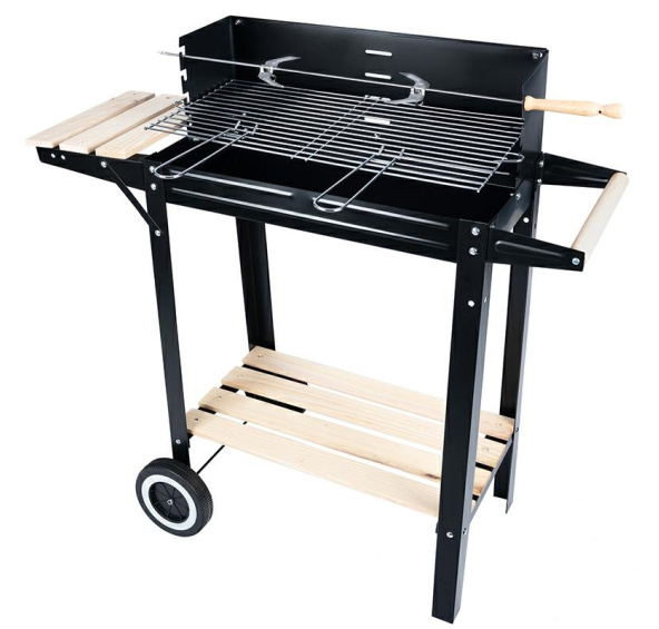 Specifikace: -materiál: kov + dřevo -celkové rozměry: šířka: 87cm x výška: 83cm x hloubka: 41,5cm -práškově lakováno -ohniště: 52 x 27 cm hloubka: 6cm (práškově lakováno) -chromovaný rošt: 50 x 24,5cm průměr drátu: 3mm -boční police vyrobená ze dřeva: 20cm x 28cm -spodní police: 53cm x 32cm -výška nastavení roštu: 7-18cm od dna ohniště -4 úrovně nastavení roštu -polský návod v balení -rožeň na pečení -tloušťka plechu cca: 1mm -kola z plastu rozměry kartonu: 70 x 30 x 10cm Množství ks. na paletě: 80