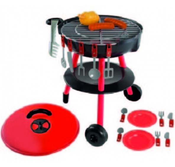 Dětský gril s příslušenstvím. Plastová hrací souprava barbecue gril na kolečkách s víkem. Součástí grilu je nejen grilovací náčiní, ale i suroviny pro přípravu jídla na gril. Gril je na kolečkách, takže s ním může dítě popojíždět podle potřeby.