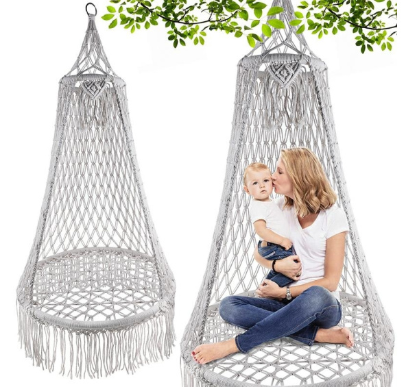 Závěsné křeslo do zahrady na terasu nebo balkon vyrobené z pevného provazu a kovových obručí. Pevné upevnění zajišťuje bezpečnost. Křeslo má baldachýn vyrobený z odolného pleteného materiálu. Značka: Carruzzo materiál: bavlna + pozinkovaná ocel + polyester Rozměry: průměr sedáku: 80 cm celková výška: 140 cm maximální zatížení: do 120 kg délka třásní: 15 cm Rozměry kartonu: 82x82x4,5 cm