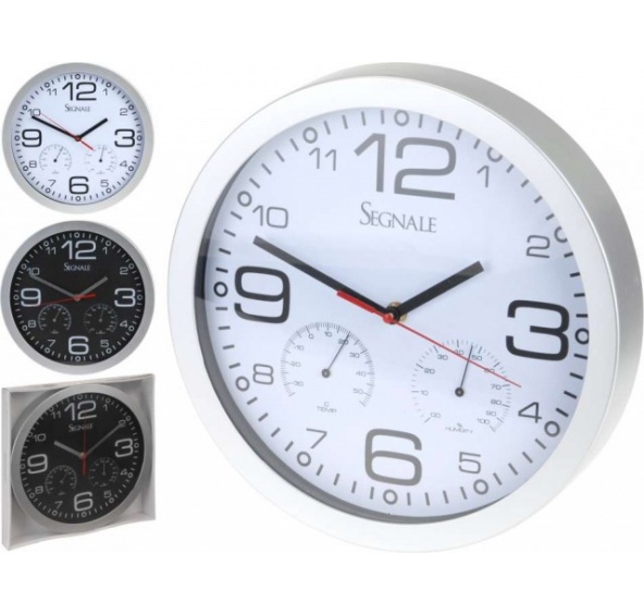 Popis produktu Hodiny nástěnné s teploměrem a vlhkoměrem 30 cm - EXCELLENT- průměr: 30 cm- stříbrný rám- ciferník: bílý nebo černý- 2 plně funkční ukazatele:- teploměr ve stupních C°- vlhkoměr v %