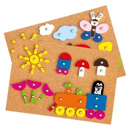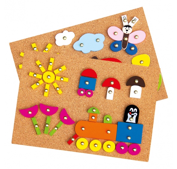 Oblíbená hra s kladívkem s motivem Krtečka, podporuje tvořivost a představivost dětí. Z rozmanitých různobarevných dílků lze vytvořit mnoho motivů a pomocí hřebíčků a kladívka je připevnit do korkové podložky.