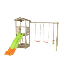 Dominantní kovová věž se stříškou vysoká 250 cm s plošinkou ve výši 120 cm a klouzačkou dlouhou 260 cm, pod věží možnost zbudování pískoviště, 371 cm široká sestava-2 sedátka+1houpací kluzák+klouzačka 230cm dlouhá s nástupní plošinkou ve výši 120cm,