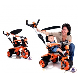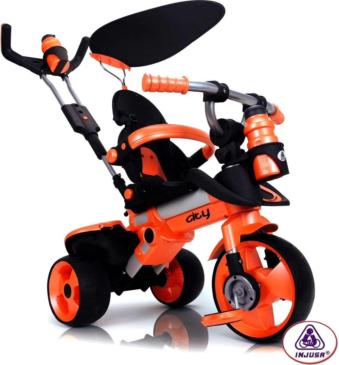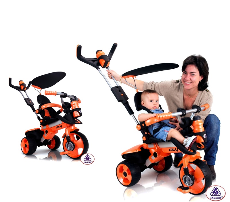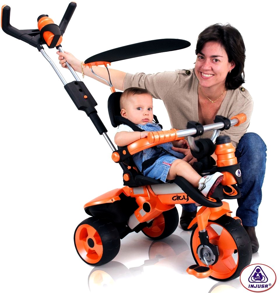 Dětská multifunkční tříkolka CITY Orange od španělské firmy INJUSA, určená pro děti od 6 měsíců.
