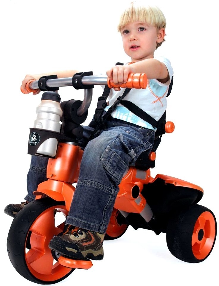 Tříkolka je vybavena hlinikovým rámem, pětibodovým bezpečnostním pásem, protiskluzovými pedály, ergonomický tvarovanými rukojet'mi říditek (gripy), ochrannou stříškou proti slunci a kolečkami opatřenými gumovými běhouny.