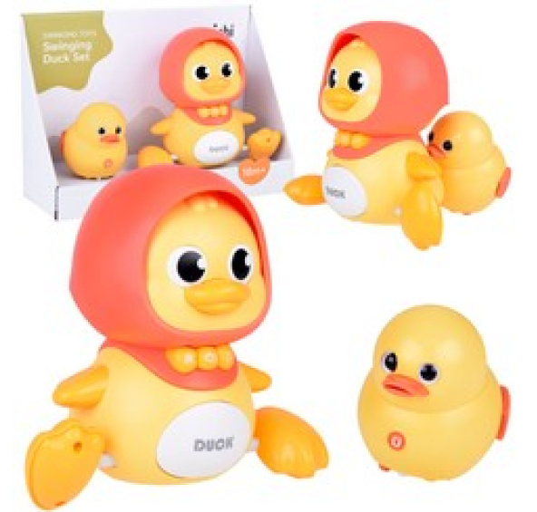 Roztomilé, hrající kachničky jsou ideální hračkou pro malé děti, skvěle se hodí při plazení dítěte. Maličký bude moci klidně lézt za kačenkami. Velká kachna vydává veselé melodie, které jistě povzbudí ke hře. Navíc se kačenka pohybuje po rovném povrchu, rytmicky se kývá ze strany na stranu do rytmu hudby. Hračku doprovází světélko na bříšku, které lze vypnout stisknutím. Kachničku se zapíná pomocí tlačítka umístěného vzadu. Hračka nabízí možnost jízdy s hudbou nebo samostatné přehrávání melodií. Přední tlačítka umožňují regulaci hlasitosti a tlačítko "měsíc" spouští ztišenou melodii, ideální pro uspávání dítěte. Díky vestavěnému magnetu lze kačenky spojit a vytvořit roztomilý "vláček".