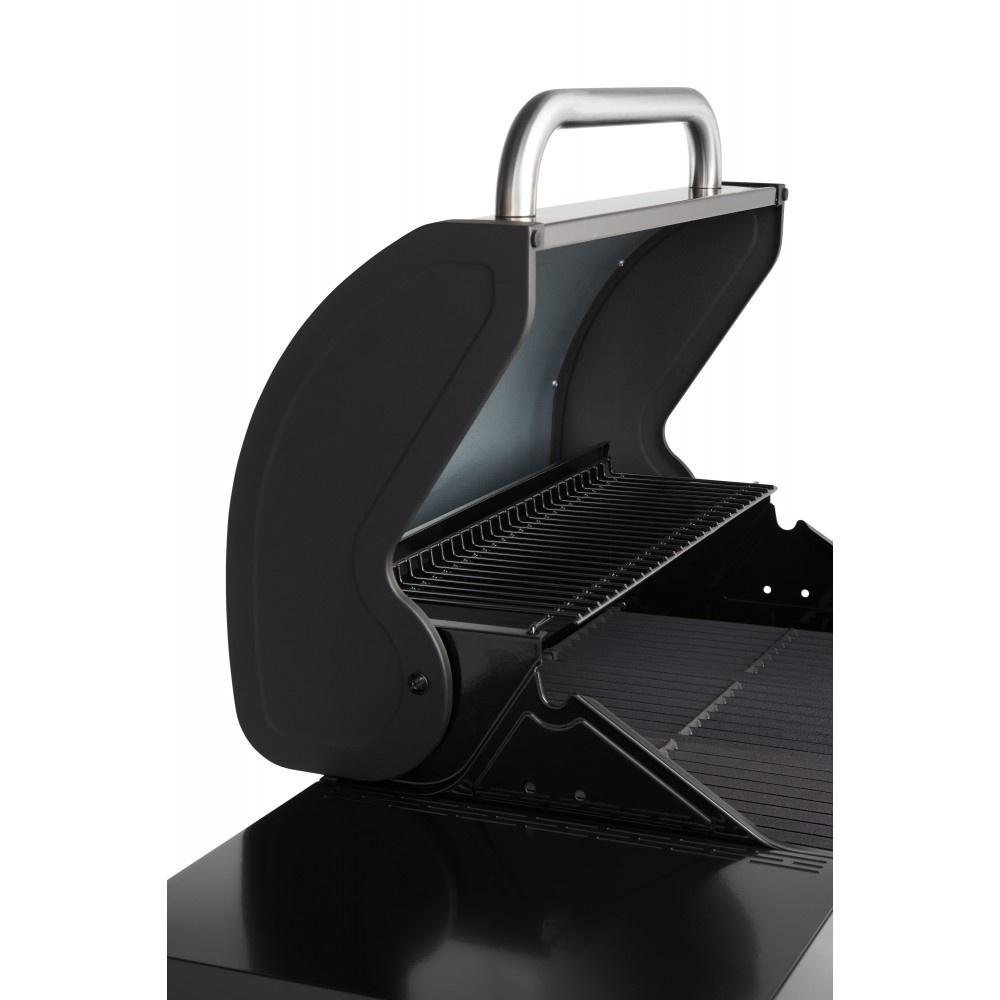 Velice praktický je odkládací rošt, kde můžete udržovat již hotové pokrmy stále teplé a připravené ke konzumaci. Gril je osazen praktickým sklopným víkem se zabudovaným teploměrem