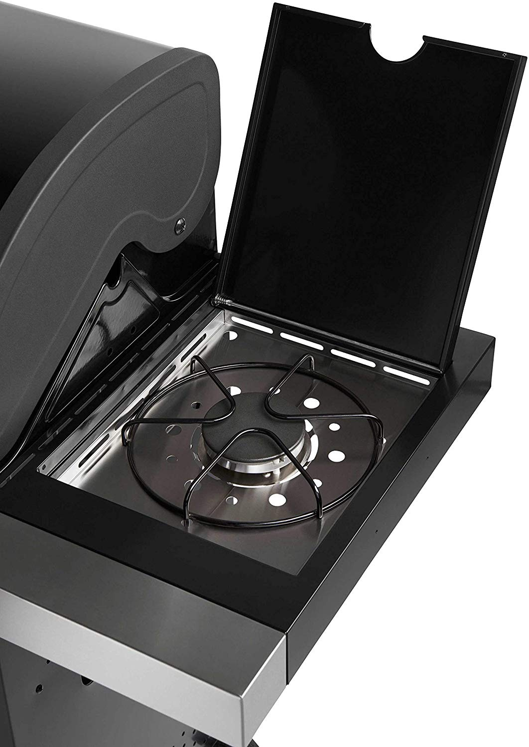 Gril je navíc vybaven vestavěným bočním hořákem, který je integrován do pracovní desky - pohodlně tak připravíte současně s grilováním oblíbené omáčky nebo přílohy. Praktické uzavíratelné víko bočního hořáku dovoluje v případě uzavření použití jako pracovní nebo odkládací plocha.