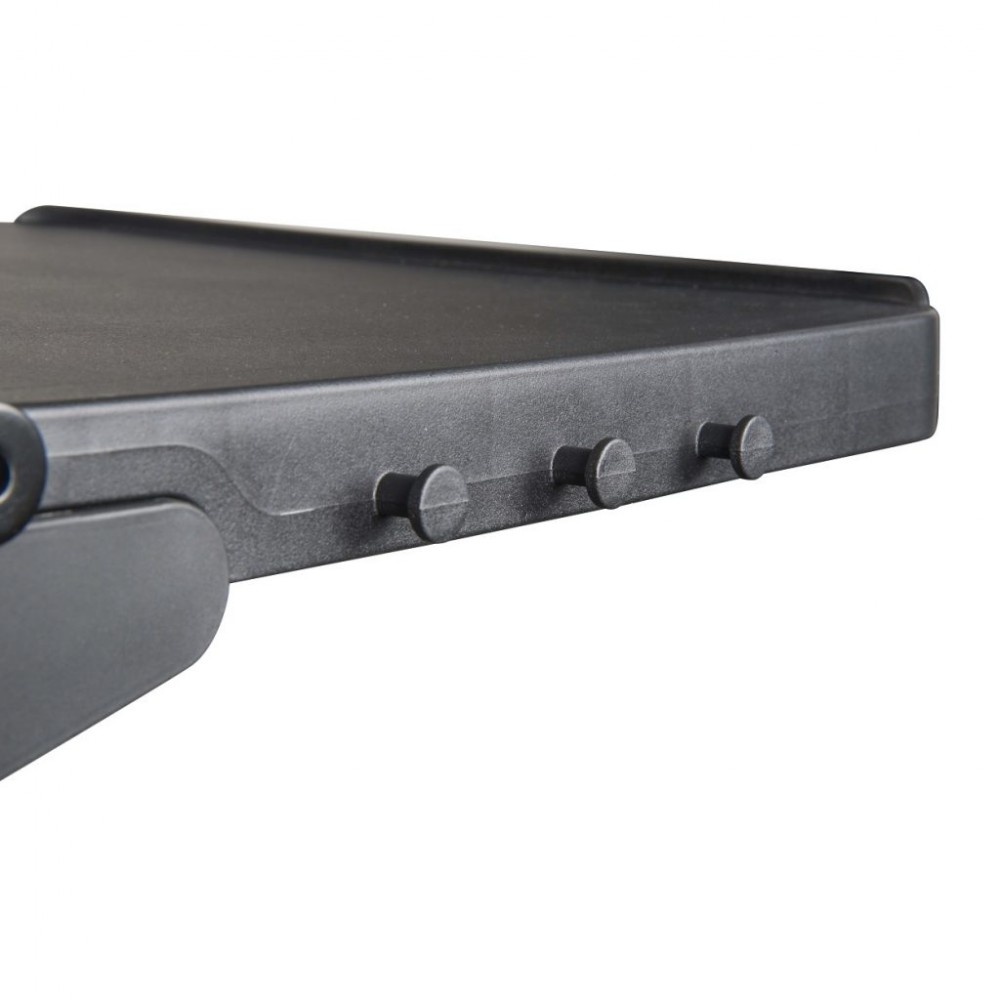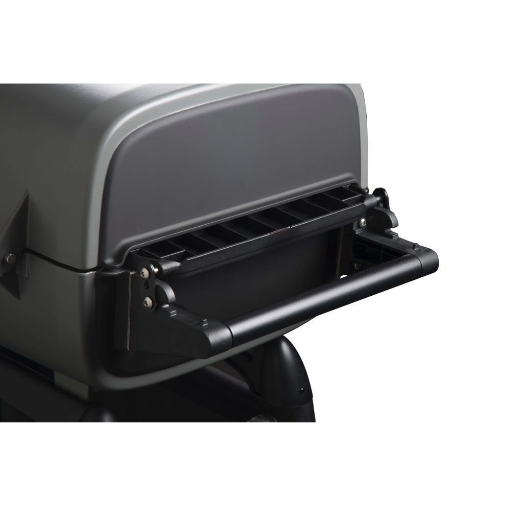 Gril je navíc vybaven bočními vestavěnými pracovními desky, které jsou také sklopné. Gril je osazen praktickým sklopným víkem se zabudovaným teploměrem.