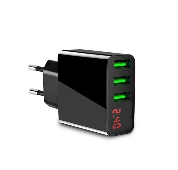 Síťová nabíječka 3xUSB s voltmetrem a ampérmetrem. Díky přesnému měření lze určit stav a úroveň nabití akumulátoru nabíjeného zařízení. Technická specifikace: - LCD displej zobrazující napětí a proud nabíjení - 3 x USB port 5V 3A (max): rozměry: 9x5x2cm
