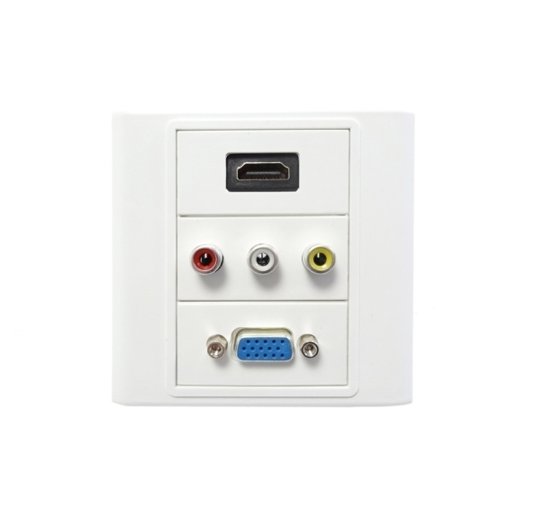 Multi připojení na stěnu Nachází široké uplatnění v instalacích audio-video vysoké kvality.Panel je vybaven jedním VGA portem (tzv. D-SUB - používané m.in. v projektorech, televizorech nebo počítačích), 3 cinch zásuvky a 1 HDMI. Kryt je vyroben z vysoce kvalitního plastu. Pasuje do standardních plechovek používaných v Polsku a Evropě. <<