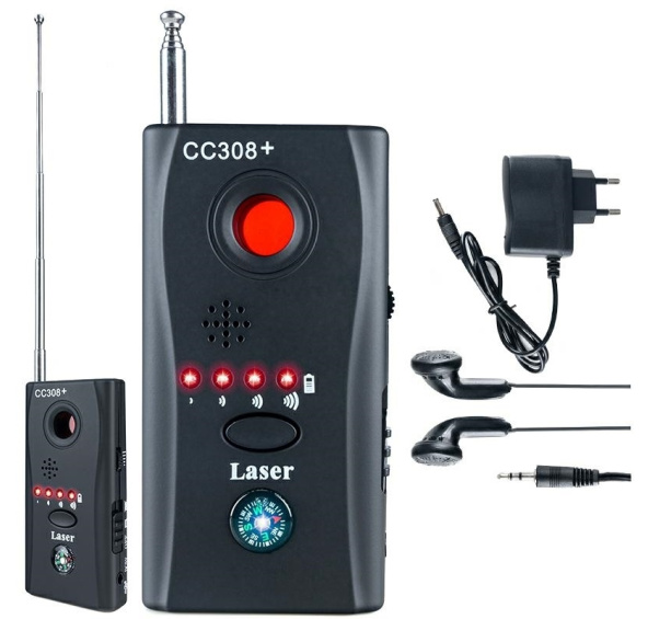 Detektor kamer, odposlechů a dalších špionážních zařízení model CC308+ Vlastnosti produktu: - široký rozsah kontrolovaných frekvencí 1-6,5 GHz - optická 4 diodová signalizace síly signálu - zvuková signalizace - vysouvací anténa - eliminace falešných rušení - diskrétní v provozu (nevydává žádné zvuky) - výkon detekovaných objektů: 50mW-200mW (rozsah detekce 30-50 cm) - výkon detekovaných objektů: 300mW-600mW (rozsah detekce 100-200 cm) - výkon detekovaných objektů: 800mW-1200mW (rozsah detekce 300-1000 cm) - vestavěná lithiová baterie 110mAh - laserová sonda - speciální pozorovací filtr - pouzdro z odolného plastu - napájecí adaptér: AC 110-230V 50/60Hz - sluchátkový vstup – sluchátka v balení - kompas - napájení vestavěnou baterií (nabíječka v balení) - barva: černá - miniaturní rozměry: 93x47x15 cm