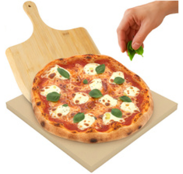 Ruhhy kámen na pizzu 38×36 cm s bambusovou špachtlí 2v1 kordierit