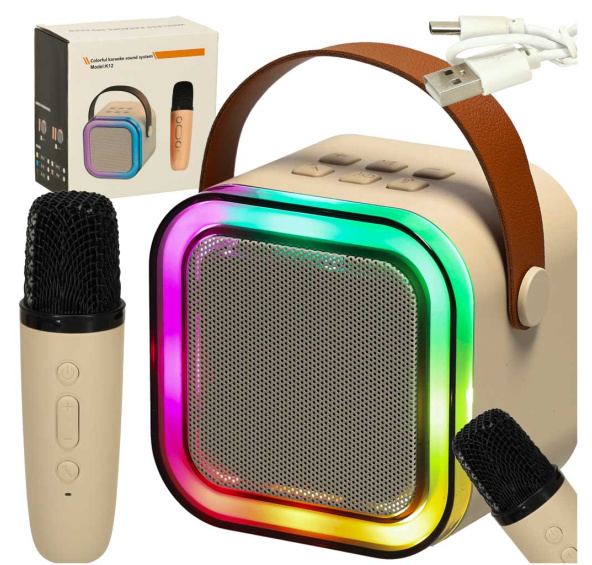 KARAOKE SET MIKROFON + PŘENOSNÝ REPRODUKTOR BLUETOOTH USB LED BEIGE