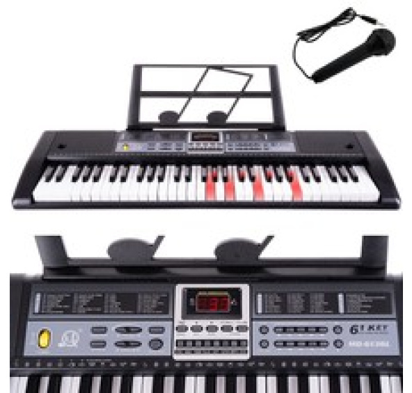 • SPECIFIKACE - věk: 3+; barva: černá a bílá; počet klíčů: 61; ovládání hlasitosti; napájení: 6xAA (není součástí balení) nebo AC adaptér (není součástí balení); rozměry (délka/šířka/výška): 25/81/25cm; hmotnost: 1,96 kg; hmotnost s obalem: 2,4 kg.