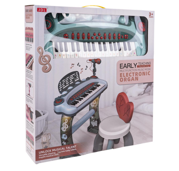 | Pianinko na stojánku s mikrofonem a stoličkou pro děti od 3 let. Pianinko je napájeno bateriemi typu 4 x AA 1,5 V (nejsou součástí balení). Má 22 bílých kláves a 15 černých. Bílé klávesy jsou navíc označeny, což usnadňuje učení, a v sadě se nachází knížečka s příkladovými notami pro zahrání několika písní. Během stisknutí se bílé klávesy rozsvítí, stejně jako boky stojanu. Pianinko má zvuky rocku, disco, valčíku, pochodu, přehrává zvuky nástrojů jako je piano, trubka, klavír, varhany a kytara. Je také demo verze, která přehrává veselé melodie. Můžeme nahrávat hrané písničky a potom je přehrávat. Pianinko má vstup na mikrofon, vstup MP3 a vstup napájení.