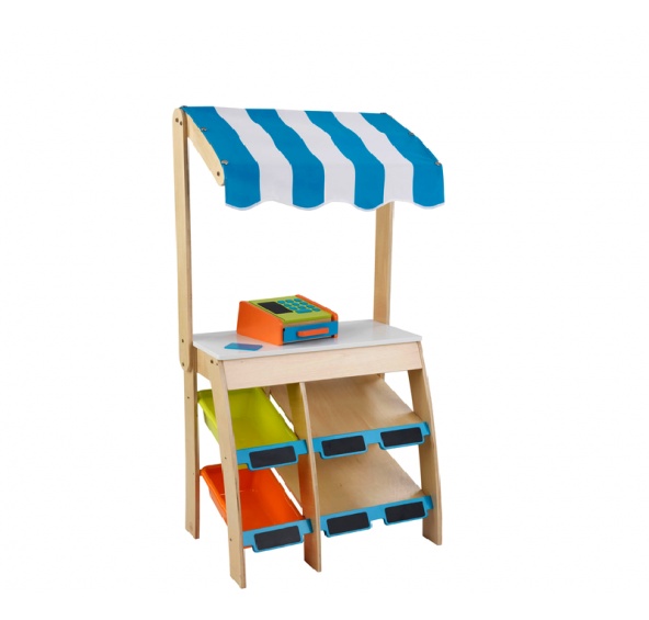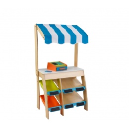 • Sestava dětského prodejního stánku zahrnuje stánek, látkovou stříšku, funkční pokladnu