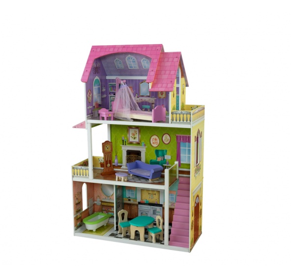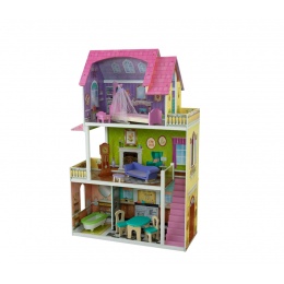 Domeček má tři patra, čtyři pokoje, schodiště spojující přízemí s druhým patrem a dva balkóny. V domečku najdou holčičky 10 kusů nábytku, včetně závěsného lustru, postele s nebesy a pendlovky.