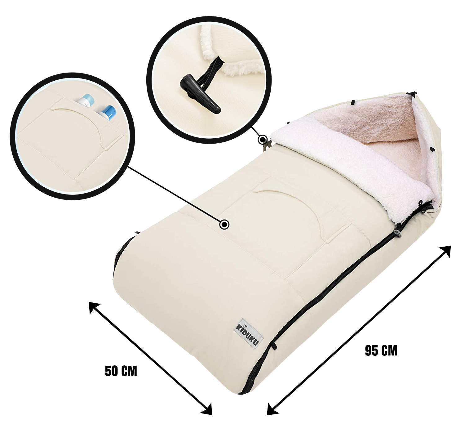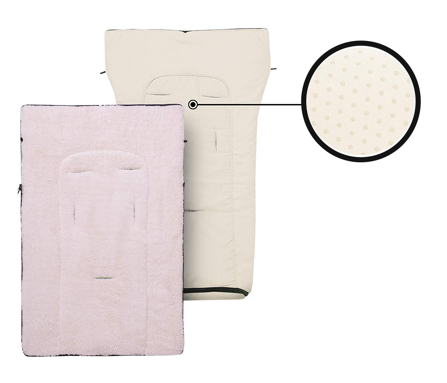 Dětský fusak má rozepínací zip, otvory na 3-bodové bezpečnostní pásy a gumové úchytky umožňující připevnění ke kočárku.