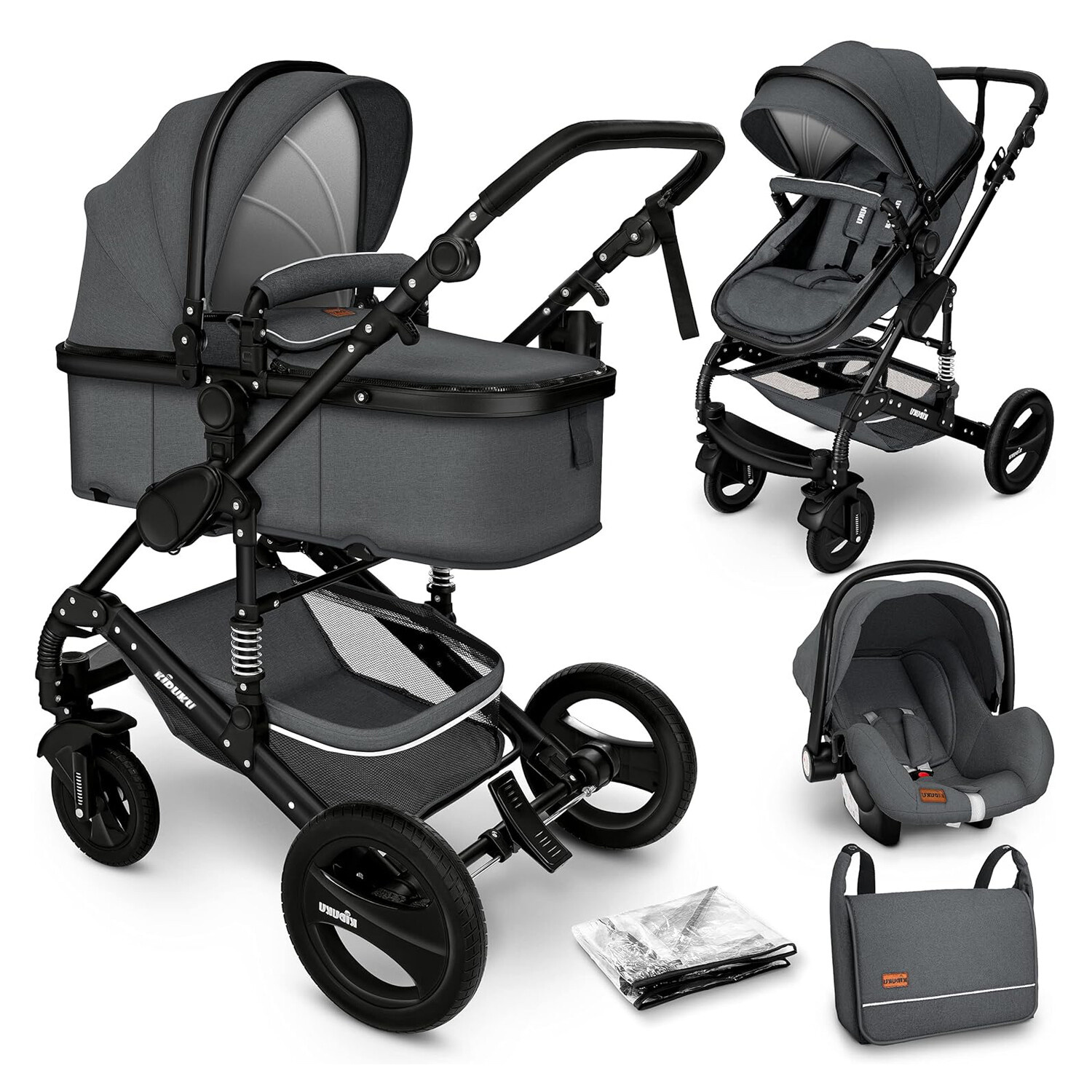 Kiduku Kombinovaný kočárek 3v1 Šedý/Černý