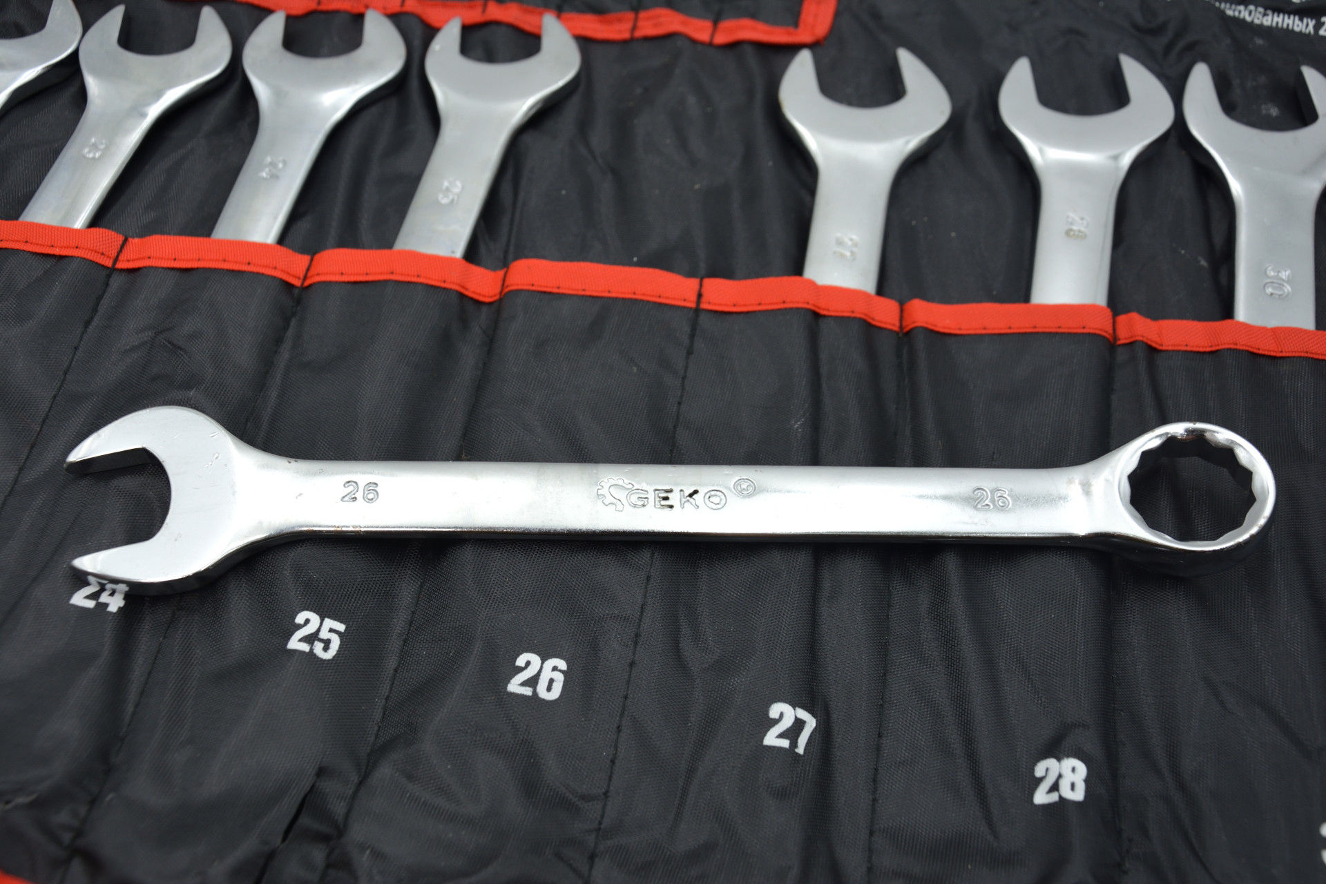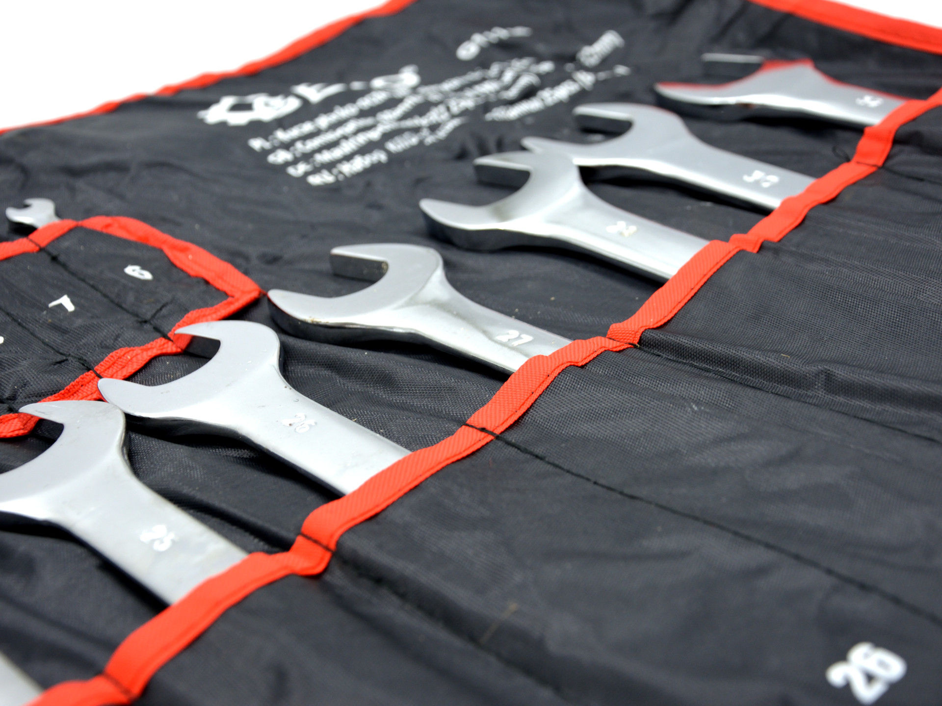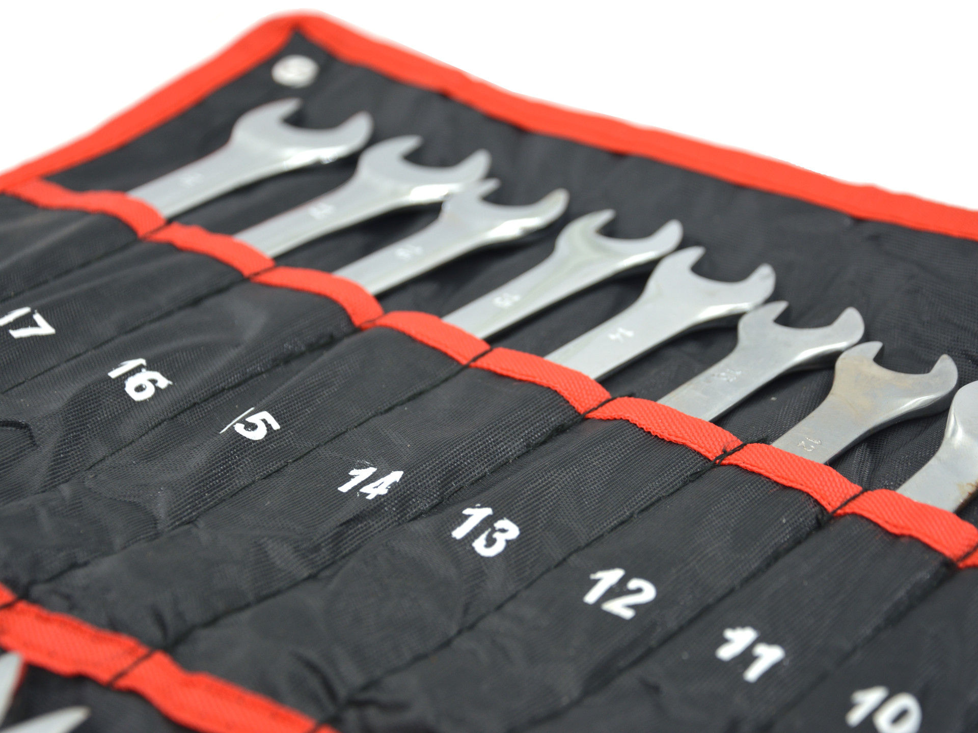 Sada očkoplochých klíčů je zabalena v pohodlném rolovacím pouzdře, díky kterému zabírá málo místa. Otvory v horních rozích pouzdra umožňují pověsit klíče na zeď.