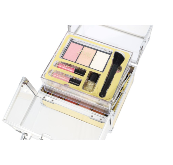 Kosmetický kufřík akrylátový zlatý ‚Glam‘ – celkem 64 ks příslušenství. Obsahuje 30 ks očních stínů, 2xlesk na rty, 1xtřpytivý lak na nehty,1xštětec, 3xoční linky, 7xkrémová rtěnka, 6xštětec, 4xtřpytkový krém na tělo, 4xkrémové oční stíny, 2xoboustranný aplikátor, 1xtužka na oči, 1xtužka na rty, 1xmalý šteteček na rty a 1xmalý štěteček na pudr. Dermatologicky testováno, vyhovuje přísným normám EU.