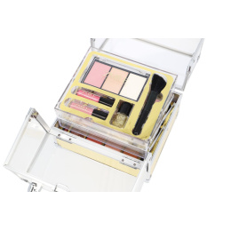 Kosmetický kufřík akrylátový zlatý ‚Glam‘ – celkem 64 ks příslušenství. Obsahuje 30 ks očních stínů, 2xlesk na rty, 1xtřpytivý lak na nehty,1xštětec, 3xoční linky, 7xkrémová rtěnka, 6xštětec, 4xtřpytkový krém na tělo, 4xkrémové oční stíny, 2xoboustranný aplikátor, 1xtužka na oči, 1xtužka na rty, 1xmalý šteteček na rty a 1xmalý štěteček na pudr. Dermatologicky testováno, vyhovuje přísným normám EU.