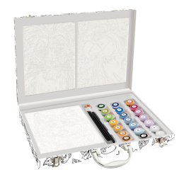Kufřík s malováním podle čísel obsahuje předtištěné obrázky na plátně (3 ks – lev, papoušek a vlk) s čísly, 21 očíslovaných barev, 2 kulaté a 1 plochý štětec. Velikost kufříku 35×25 cm.