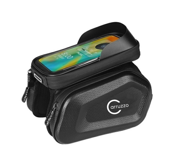 Univerzální dvojitá taška připevněná na rám kola s průhlednou kapsou na telefon, mapu, navigaci atd. Bezinvazivní montáž pomocí pásek se suchými zipy - nevyžaduje vrtání do rámu. Značka: Carruzzo Specifikace: pásky se suchým zipem pro montáž zpevněné vodotěsné pouzdro s povrchovou úpravou z karbonové fólie průhledné okénko pro umístění telefonu nebo mapy (fólie umožňuje ovládání zařízení s dotykovým displejem) max. velikost telefonu: 7 palců vnější rozměry.:20x17x15cm materiál: PU+EVC+TPU+PE horní potah upevněný na suchý zip