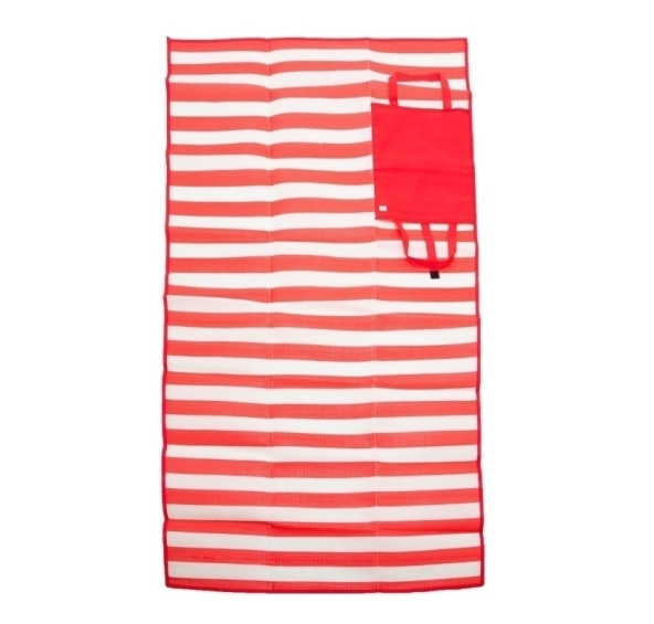 Koberec/Podložka na pláž, určená k použití během odpočinku na pláži. Vyrobena z odolných syntetických materiálů, odolná proti poškození a snadno udržovatelná v čistotě. Po ukončení používání lze podložku složit a sepnout suchým zipem. Vybavena rukojetí, která umožňuje pohodlné přenášení. Po složení podložky může sloužit jako praktická taška díky navrženým kapsám. Specifikace: - materiál: polypropylen, PVC - rozměry po rozložení: 175x90 cm - rozměry po složení