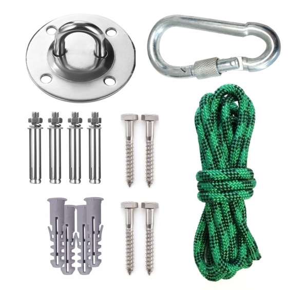 Sada: držák + karabina + lano + montážní hmoždinky pro upevnění houpačky nebo houpací sítě. Vyrobeno z odolného a pevného kovu. Vlastnosti produktu: - velmi odolný kov - snadné zavěšení houpačky/houpací sítě díky karabině - univerzální montáž na 4 kolíky - 2 sady kolíků po 4 ks. - linka o délce ok. 4m - max. zatížení 200 kg rozměry kartonu: 10,5 x 10,5 x 10,5 cm Počet kusů. na paletě: 700