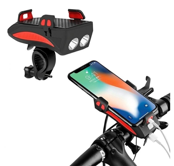 3v1 cyklistická lampa s klaksonem a držákem na telefon. Díky diodám s vysokým výkonem výrazně zvyšuje bezpečnost na silnici a zlepšuje viditelnost. Specifikace: 2 silné LED diody T6 (každá 5W) velmi silné světlo: 400lm hlasitost zvukového signálu: 130dB napájení: akumulátor 2000mAh (kabel microUSB pro nabíjení v balení) nastavitelný držák na telefon (4-6,3") univerzální montáž lampy a dálkového ovladače drátový dálkový ovladač upevněný na řídítkách pro pohodlné spuštění klaksonu vodotěsné USB porty funkce powerbanky: výstup USB-A 5V 0,8A funkce klaksonu (5 zvuků na výběr) 3 režimy svícení (nepřetržité silné světlo, nepřetržité slabé světlo a přerušované světlo) rozměry lampy: 12x6x5,5cm