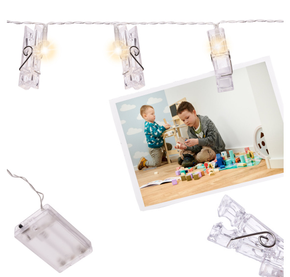 Věnec s klipy LED je moderní verzí tradičních foto rámečků. Můžete ji zavěsit kamkoli a tvarovat ji, jak se vám zlíbí. Díky 2 metrům kabelu můžete ve svém pokoji vytvořit krásnou dekoraci.