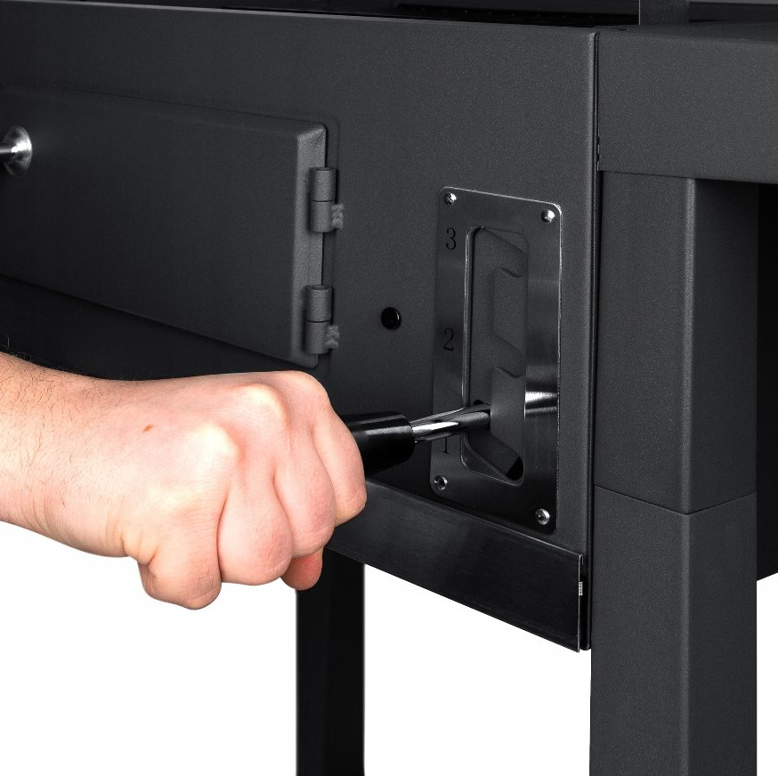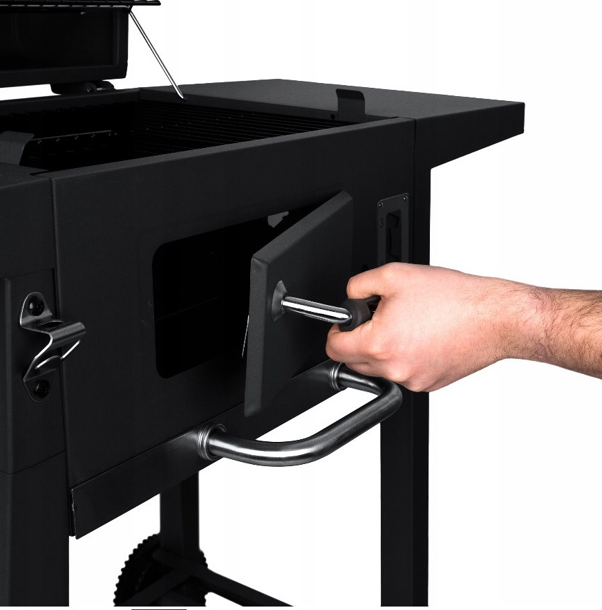 Speciální větrací otvory poskytují během grilování vyváženou cirkulaci vzduchu a zabrání vyhasnutí ohně. Klikou si snadno nastavíte výšku roštu.
