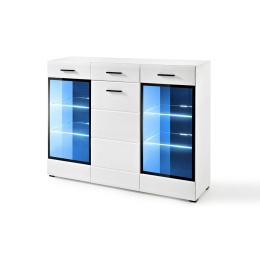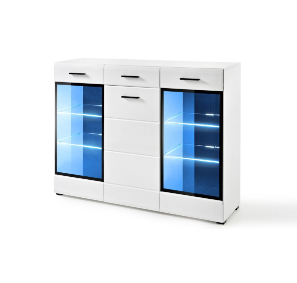 Popis produktu LAUREN komoda HB biały/biały MDF połyskLAUREN komoda HB wymiary: długość: 150 cm wysokość: 112 cm głębokość: 41 cm materiał: Korpus: biały MDF matowy Fronty: bialy MDF połysk Uchwyty: plastikowe