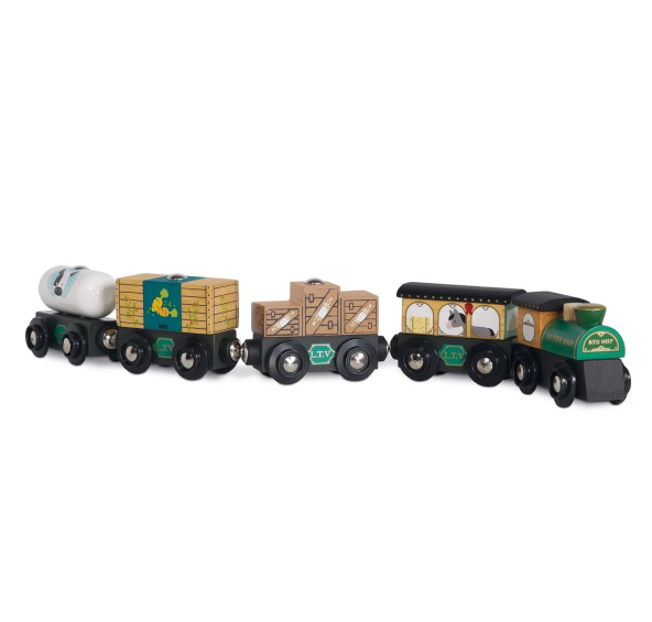 Tento krásný a ručně vyrobený vláček už se nemůže dočkat výletů plných dobrodružství! Perfektní doplněk jakékoliv vláčkodráhy. Zelený vlak při rozvozu nákladu děti vtáhne do světa plného představivosti a kreativity. Je vyroben z pevného a udržitelného kaučukového dřeva, má kvalitní ilustrace a zlatavé detaily. Spoje vagónů jsou magnetické, hračka trénuje motoriku. Kompatibilní s dalšími dřevěnými vlaky a vláčkodráhami. Hlavní vlastnosti: vyrobeno eticky z udržitelného dřevatestováno dle nejpřísnějších standardůmalováno netoxickými barvami na bázi vodyvhodné pro představivou hrupomáhá s rozvojem řeči a sociálních dovednostípodporuje při raném vývoji Auta & stavby: Stavební a motorická kolekce Le Toy Van, která vyhrála mnoho ocenění. Přesněji prozatím přes 15 ocenění za představivá auta a stavební hračky. Podporují dětskou fantazii, jsou ideální k představivé hře, rozvíjí kreativitu a hravě zlepšují dětskou koordinaci ruka‑oko.