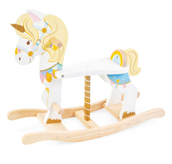 Nádherný houpací jednorožec z pevného dřeva, který vypadá jako z kolotoče. Moderní a jedinečný design tradiční hračky. Vyrobeno z hladkého a pevného kaučukového dřeva s bezpečnou konstrukcí. Jednorožec má detailní ilustrace v jemných pastelových barvách doplněné třpytkami a zlatými prvky. Sedlo je svou výškou a tvarem přizpůsobeno dětem od 1 roku. Hlavní vlastnosti: Houpací koník – jednorožec jako z kolotočeHoupání na koníkovi zlepšuje pohyblivost a rovnováhu dětíGenderově neutrální design nabádá v sdílení mezi sourozenciHračka vyhrála několik oceněníVyrobeno z upcyklovaného dřeva z udržitelných lesůDekorováno netoxickými barvami, testováno dle nejpřísnějších standardů Petilou kolekceKolekce pro nemluvňata a batolata od Le Toy Van obsahuje hlavně hmatové hračky, které mají nejmenším posloužit také jako učební prostředky. Kolekce je inspirována přírodou kolem nás a je navržena tak, aby rozvíjela smysly dětí pomocí rozdílných zvuků, textur, tvarů a hmotností. Děti tak od malička zapojí všechny své smysly.