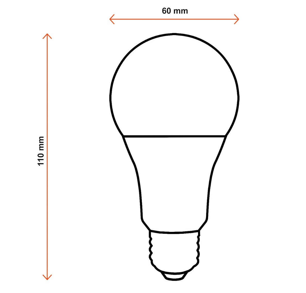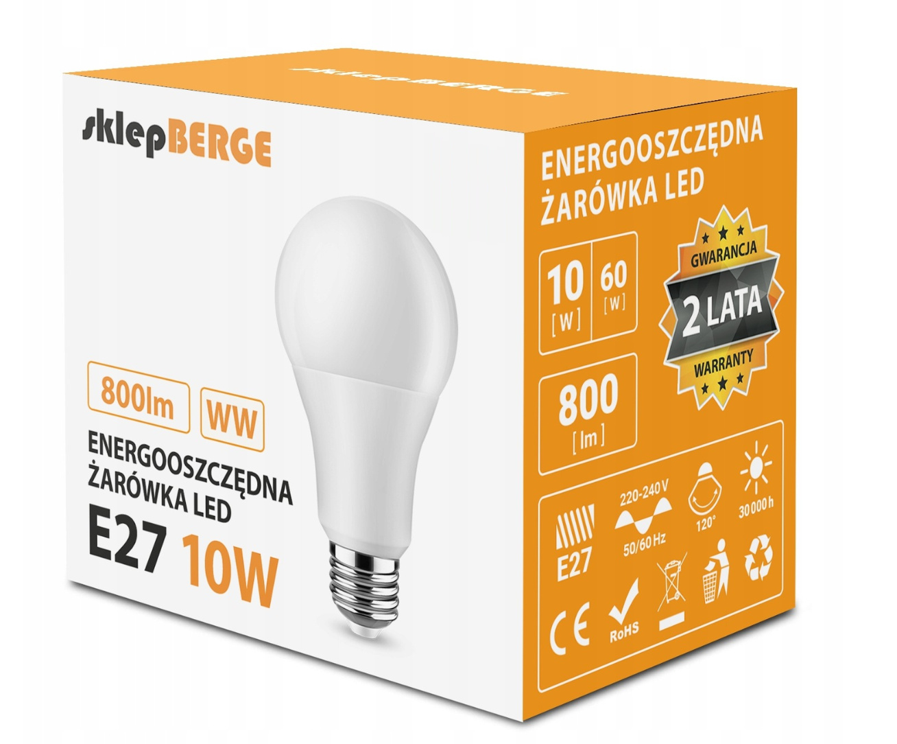 Model: E27 10W kulička A60 Napájecí napětí: 230 V AC 50-60 Hz Typ SMD diody: 2835 Světelný tok: 800/850 lm Index podání barev CRI: Ra 80 Velikost: délka 110 mm / šířka 60 mm Stmívatelné: ne Počet cyklů zapnuto-vypnuto: 15 000x Životnost: 30 000 hodin Úhel paprsku světla: 220° Výstupní výkon: 10W (odpovídá 80W světelnému zdroji) Barva světla: teplá bílá 2800/3300K Materiál: plastové pouzdro, hliníkový chladič uvnitř Certifikáty: CE, RoHS