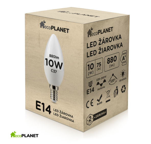 Popis produktu LED žárovka - ecoPLANET - E14 - 10W - svíčka - 880Lm - teplá bílá