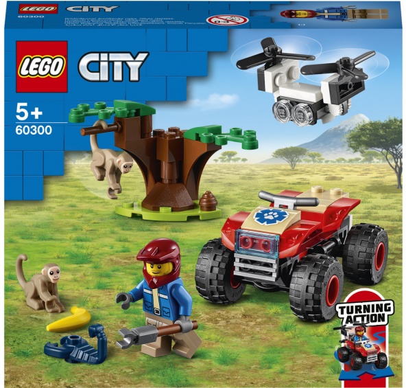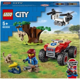 "Zasvěťte začínající průzkumníky do tajů přírody se stavebnicí Záchranářská čtyřkolka do divočiny (60300) od LEGO® City, která zaujme parádním modelem čtyřkolky do každého terénu s funkčním řízením pomocí naklánění, uchopovačem a dronem. Sada je situovaná do prostředí savany. Když se k tomu všemu přidá ještě průzkumník, opice a černý škorpion, nestojí záchranářským dobrodružstvím se zvířátky již nic v cestě.